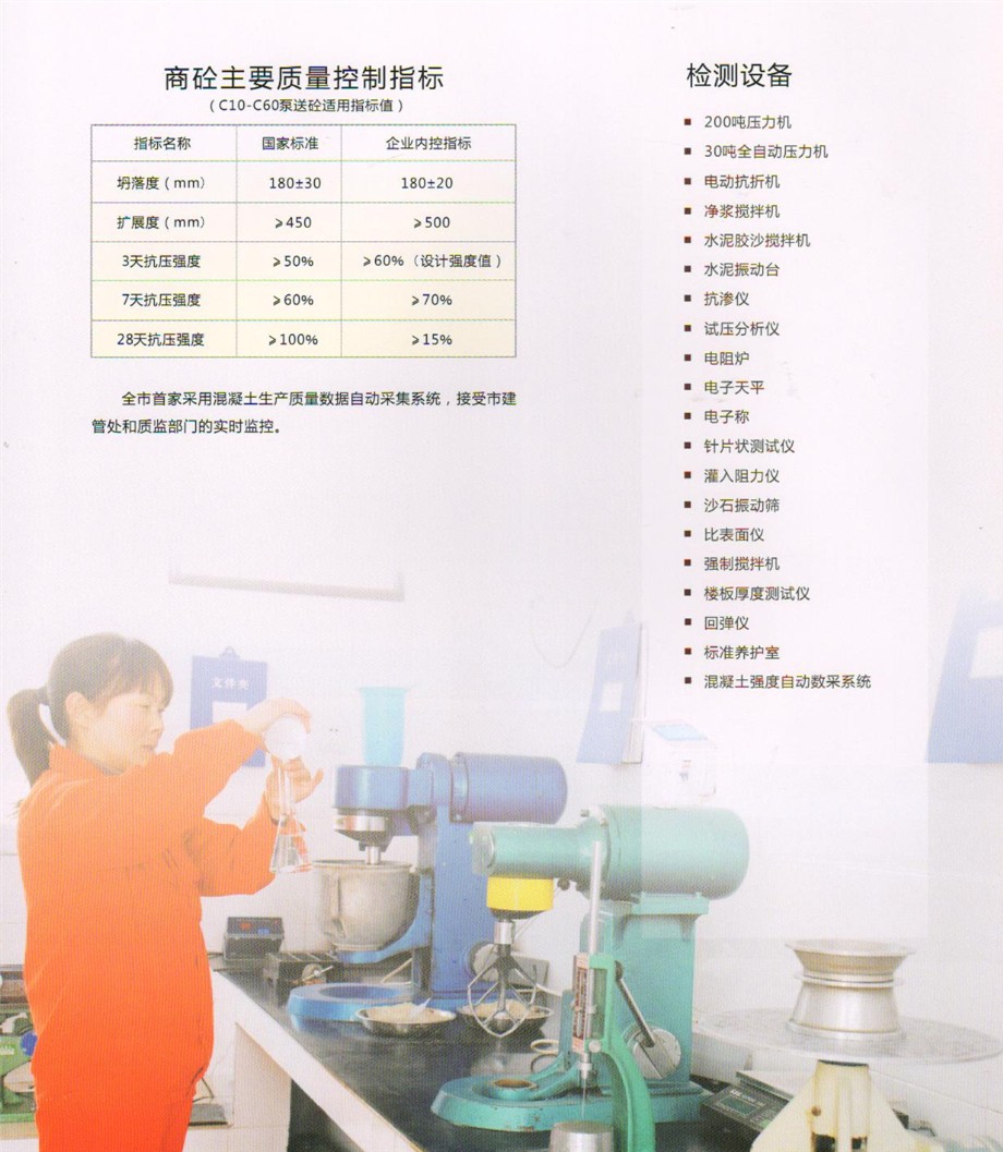 公司設(shè)有先進(jìn)的實(shí)驗(yàn)室,配備全套混凝土及原材料檢測(cè)試驗(yàn)設(shè)備,配有專(zhuān)職的試驗(yàn)、檢驗(yàn)人員,可承擔(dān)混凝土的材料性能試驗(yàn),工藝質(zhì)量控制、產(chǎn)品質(zhì)量檢驗(yàn)等全部試驗(yàn)、檢驗(yàn)項(xiàng)目,為確保混凝土質(zhì)量提供了可靠的保證。